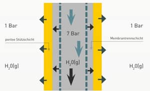 Chaque fibre creuse de la membrane est constituée d’une couche séparatrice interne perméable à l’eau et d’une couche externe très poreuse. Lorsque l’air comprimé humide se diffuse dans les fibres, l’eau qu’il contient traverse la couche séparatrice en s’évaporant sous l’effet de la grande différence de pression partielle avec l’air de balayage. De ce fait, les pores de la couche externe restent toujours perméables à la vapeur d’eau.