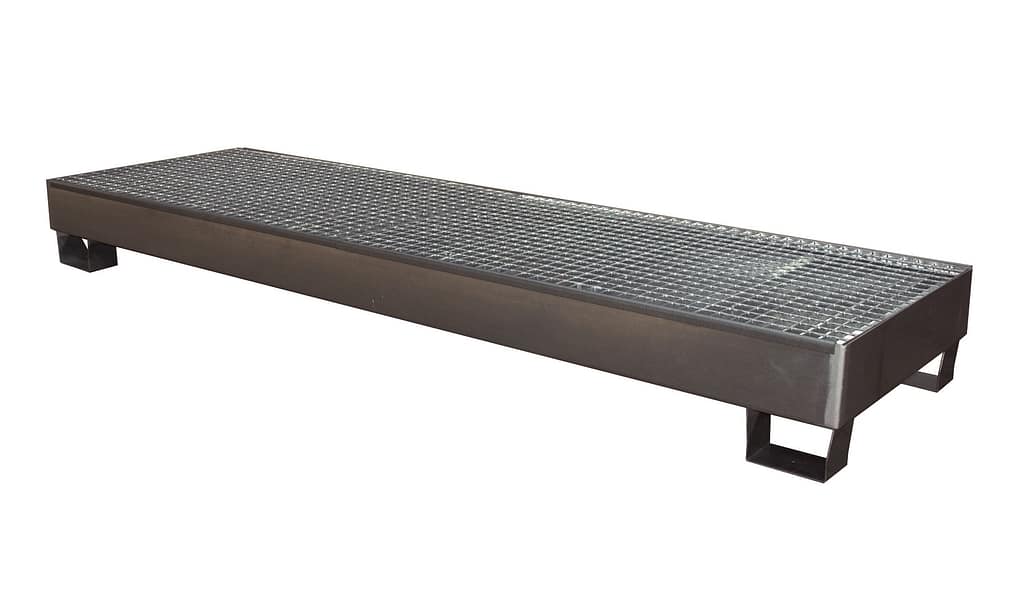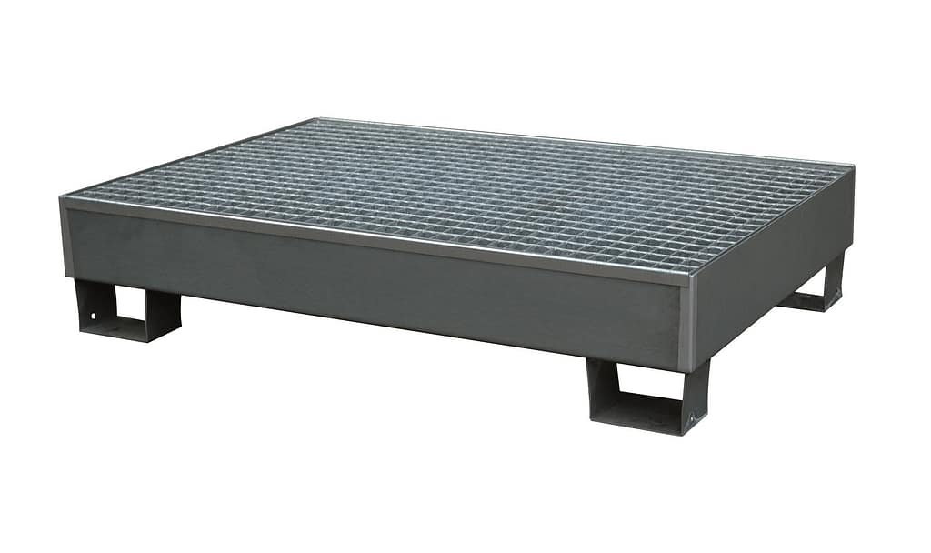 Bac de rétention pour les fûts ou petits conteneurs de 4 à 200 litres. Avec caillebotis et pieds, galvanisé.