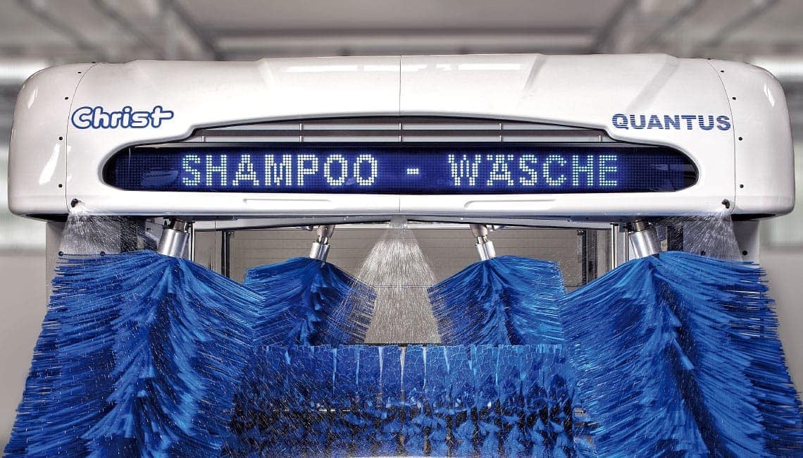 Le portique de lavage à 5 brosses QUANTUS de Christ Wash Systems est la bête de somme de la flotte de Christ. Le portique QUANTUS qui a été développé pour les sites ayant une fréquence de lavage élevée, mais un espace limité atteint une capacité étonnamment haute pour un encombrement très réduit. Les quatre brosses latérales et l’équipement haute pression Vitesse en option permettent d’atteindre un débit de max. 16 véhicules par heure sur une longueur du hall de max. 10 m. Pour que le sécheur ne ralentisse pas en dessous de la vitesse de lavage, un ventilateur High-End spécial avec une puissance accrue de 1,6 kW est intégré.