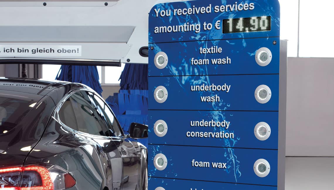Rangement centralisé des espèces et accessoires (par exemple, housses d’essuie-glace, chiffons, etc.). Avec tiroir-caisse verrouillable, tiroir supplémentaire, portes avant et roulettes. La commode de commande est dotée d’une imprimante pour tickets intégrée. Impression de ticket : Raison sociale, ligne d’accueil, programme de lavage, date, prix, T.V.A. La commode de commande est disponible avec terminal de commande à bouton plat ou à écran tactile.