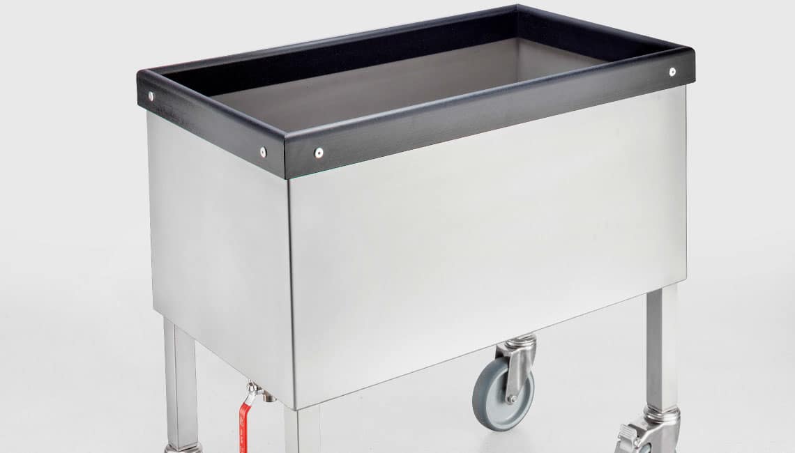 Immersion des brosses de lavage à main dans l’eau de lavage d’approvisionnement (prélavage du véhicule). Carquois pour brosse en acier inoxydable (non chauffé) avec deux chambres d’eau de lavage, roulettes et frein à rouleau, élément filtrant amovible en acier inoxydable, robinet de vidange manuel, dispositif de maintien du manche de brosse et kit de brosses de lavage à main.