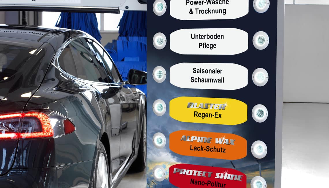 Sert à la perception optique des programmes spéciaux (par exemple, application de cire ou de produit lustrant). Le faisceau lumineux DEL peut être orienté dans le jet de mousse et l’illuminer avec des couleurs. Le système d’orgue lumineux peut être associé à l’arc en aluminium Premium ou à l’arc DURAPROTECT. Il se compose d 3 barres lumineuses à DEL (1 pour la barre transversale, 2 pour les montants).