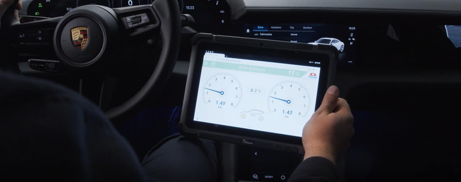 Banc d’essai de freinage numérique pour véhicules particuliers et camionnettes d’un poids maximal de 3,5 tonnes avec 2 x moteurs d’entraînement 3 kW et largeur de voie maximale de 2 200 mm.