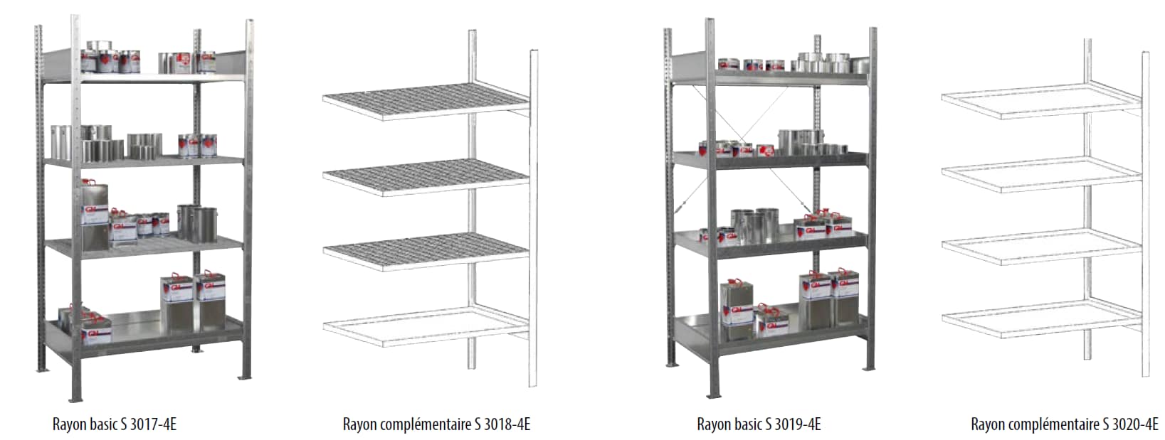 RAYONNAGES A FUTS AVEC BACS DE RETENTION TYPE SERIE 3000