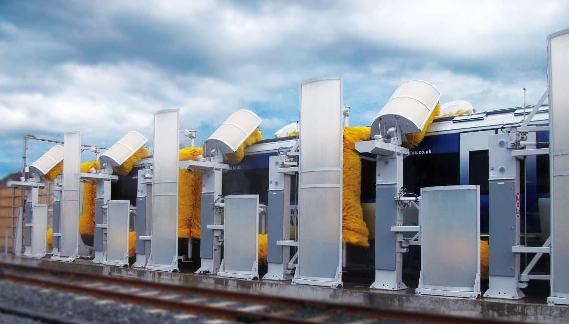 Dans ce cas, les surfaces latérales et, moyennant supplément, les toits inclinés (avec des brosses de lavage supplémentaires) sont nettoyés pendant le passage. L’installation peut être conçue indépendamment de la vitesse de passage, avec un nombre correspondant de paires de brosses, pour l’application par frottement du produit chimique et l’élimination de la saleté dissoute. Le lavage pour trains est complété avec des supports d’aspersion et de rinçage indépendants.