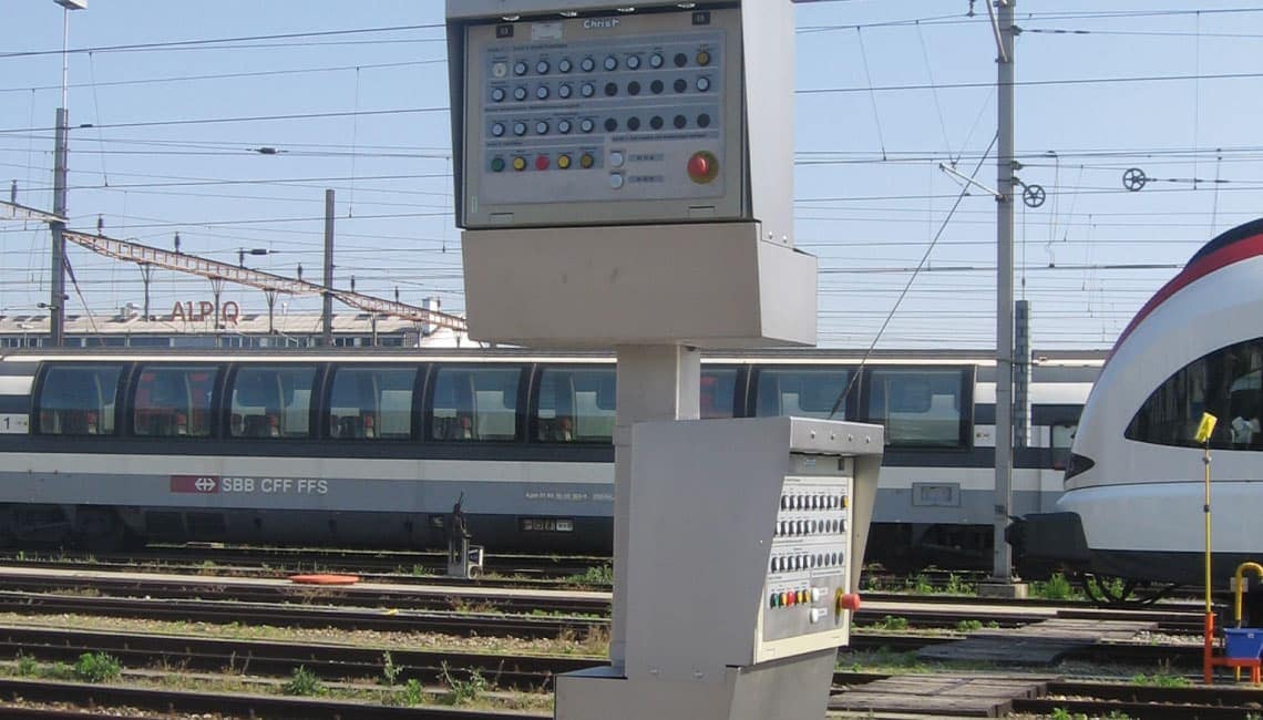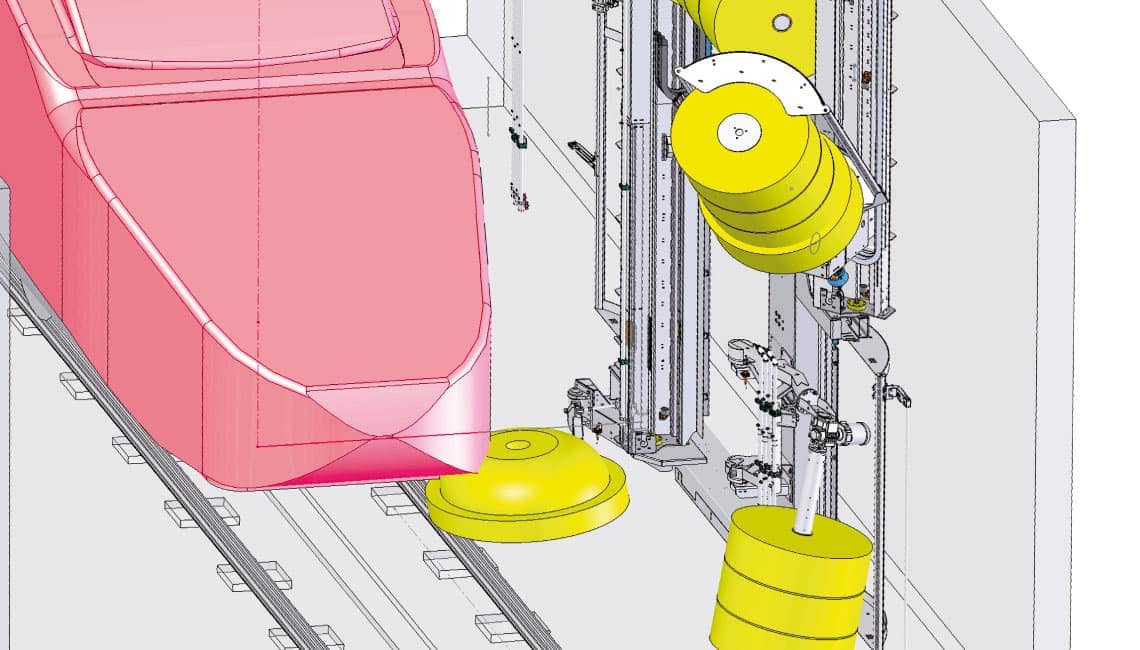 La station de lavage pour trains peut être équipée d’une brosse pour spoiler afin de pouvoir laver les contours obtus du train.