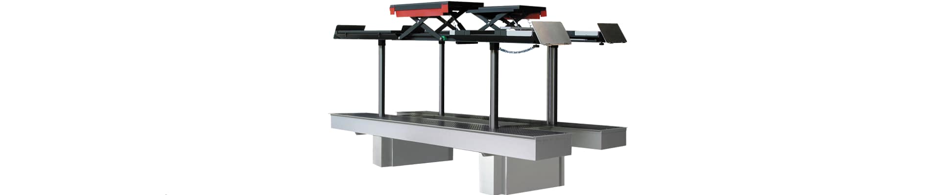 Appareil de levage souterrain avec élévateur intégré sans roue et 2 cassettes intégrées pour le levage, la réparation et le réglage de la géométrie des roues de véhicules d’un poids total jusqu’à 5 500 kg.