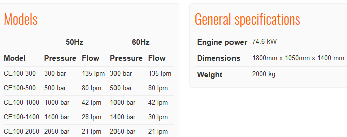 Les machines de la série CE100 sont des pompes à entraînement électrique avec une pression de 300 à 2000 bars et un débit de 21 à 135 l/min. Les châssis sont constitués de pièces en tôle emboutie galvanisée à chaud et de rails périphériques en acier inoxydable. Quatre pieds en caoutchouc pour un positionnement sûr. Un œillet de levage du crochet.
