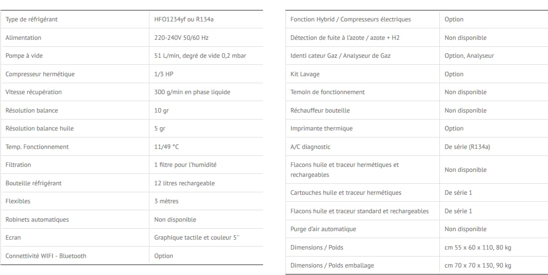 Station de recharge A/C entièrement automatique pour la récupération, le recyclage et la recharge de différents types de fluides frigorigènes. La solution innovante et exclusive permet de régler le gaz R134a ou HFO1234yf directement lors de l’activation sur le site, avec le kit d’activation.