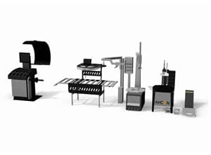 A Wheel lift, a bead breaker, an inflation station, the Match Matic, a centering lift and AHCON Power Walls in two variations.