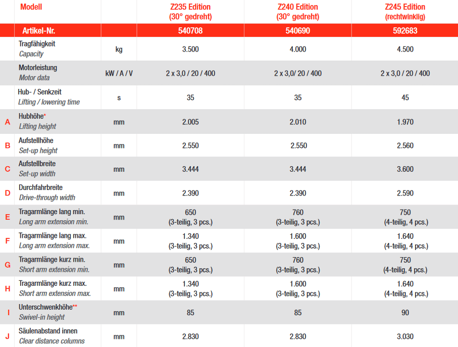 Professional, base frame free 2-post lift series suitable for lifting of small vehicles (e.g. Smart) and medium transporters with long wheel base (4.025 mm).