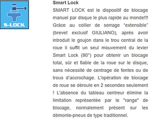 Patented SMART LOCK ultra-quick wheel clamping system, through cone and shaft with Smart Lock nut;