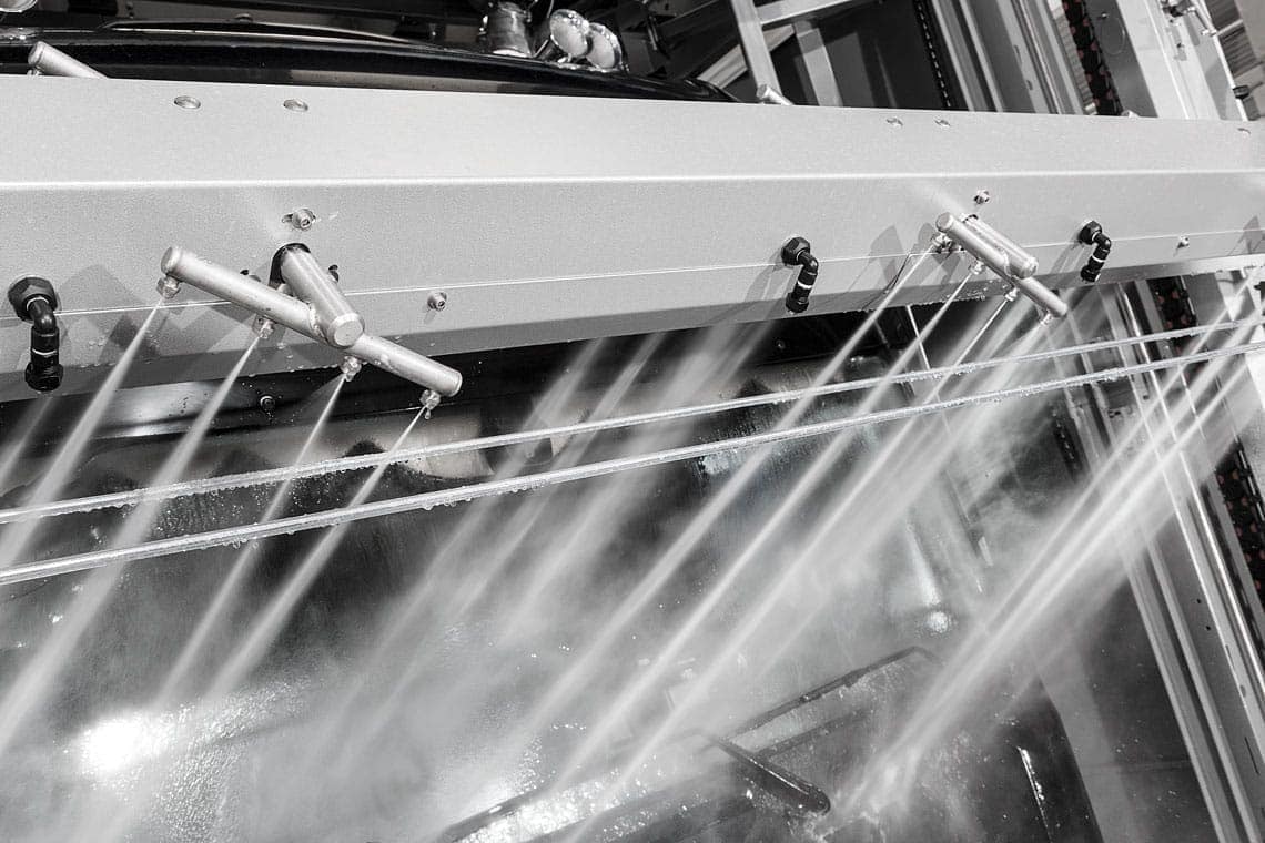 Four electro-mechanically oscillating high-pressure nozzle units per wash system side, which are equipped with contra-rotating high-pressure blast nozzles spray the vehicle powerfully while the wash system moves. The front and rear wash is performed by the integrated swivel device for the high-pressure nozzle units. The manual pre-cleaning effort required by the pre-wash staff is reduced significantly with the JETSTREAM.