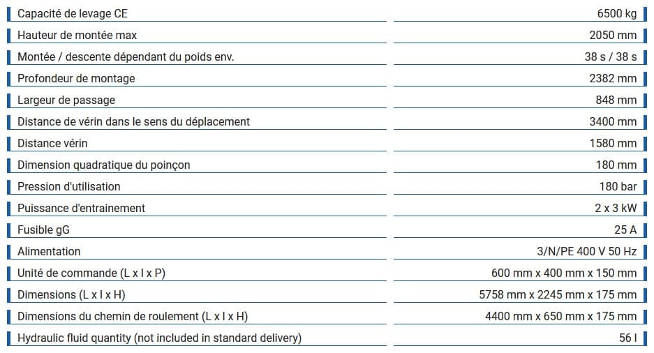 Optional conversion to chassis measurement lift with precisely aligned driving platforms, sliding plates for tension-free wheel support, driving platform levelling and Displacement device with latch rail