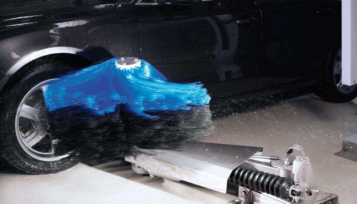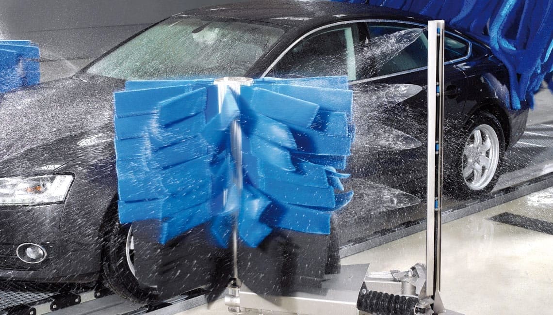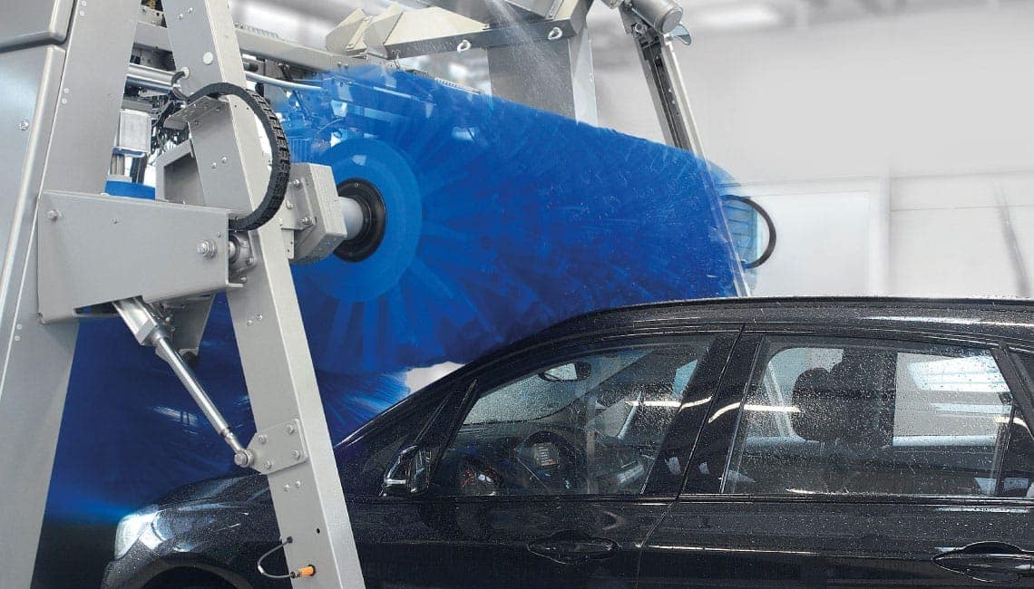 „Kinematic“ is defined as being the science of the movement of bodies in a room. This also applies to our moving roof cylinder – it moves over the horizontal vehicle surfaces to be washed and even over the rear of the vehicle and washes with simplicity and perfection without requiring any lifting motor / cables or belts. A counterweight maintains the balance and a pneumatic cylinder is used for lifting the cylinder if required. The cylinder drive is serially controlled via a frequency converter (FC). The amount of rotations required can be set for the selected wash material via the FC.