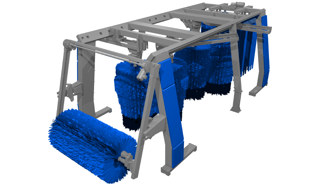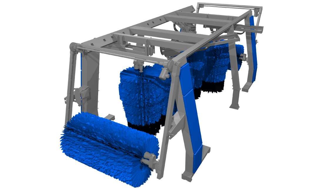 Sturdy frame made from galvanized steel with duplex powder coating and plastic doors. The side cylinders wash the vehicle’s front, side and rear. Cylinder opening controlled by active power measurement on the electric brus
