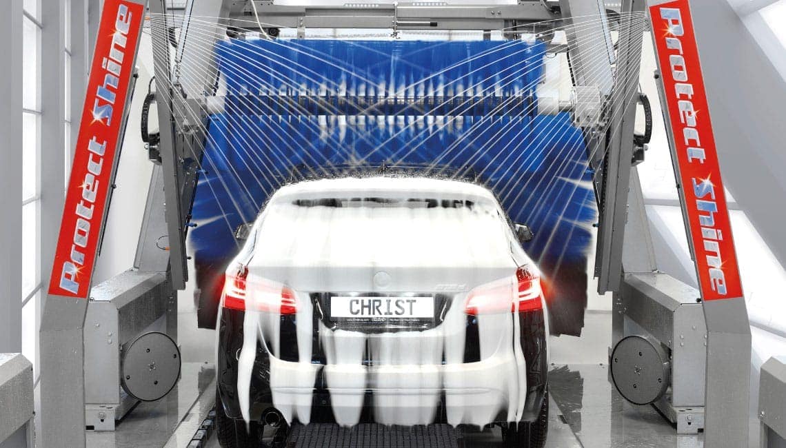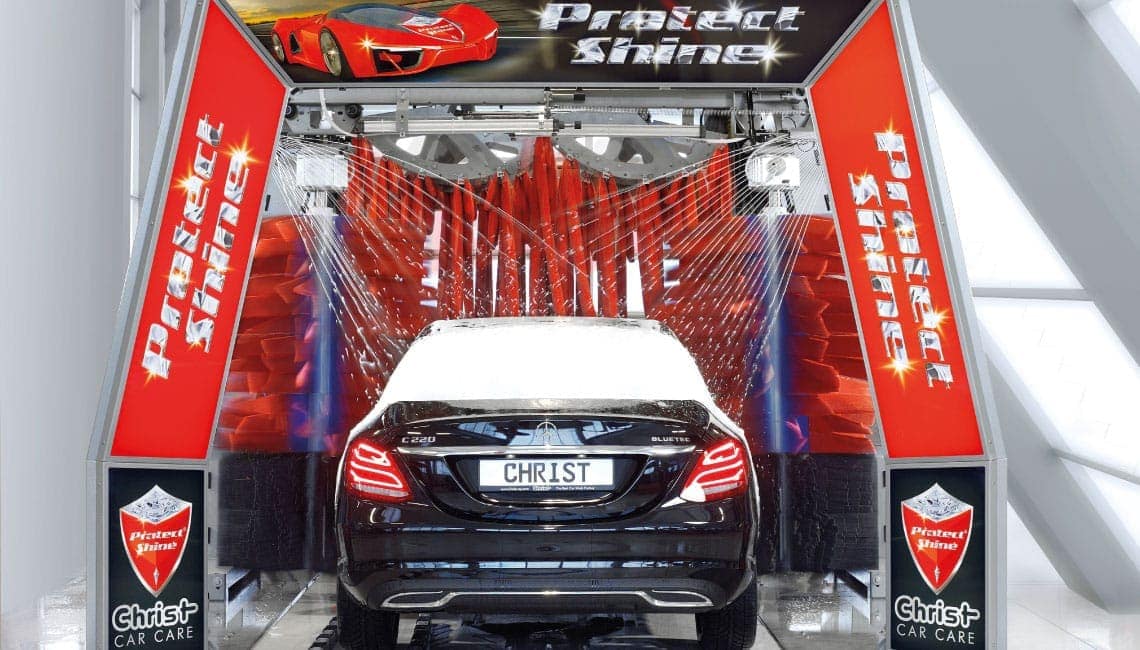 High-grade arch made from powder coated aluminum with LED background lighting for application of Protect Shine Nano Gloss Polish via two foam fan spray jets. Including full-surface adhesion in the Protect Shine design and 25 kg Protect Shine from Christ Car Care. The Protect Shine applied to the vehicle is rubbed in by the following textile wash dervices.