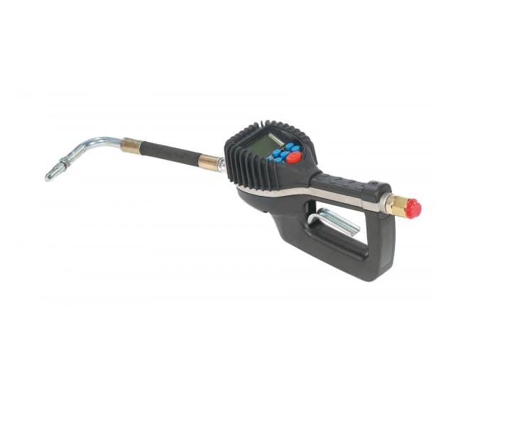 Oil dispensing gun with PRE-SELECTED or manual delivery. The user can calibrate it according to different units of measurement (litres, gallons, pints). It is supplied calibrated in litres, but can be easily calibrated by the user.