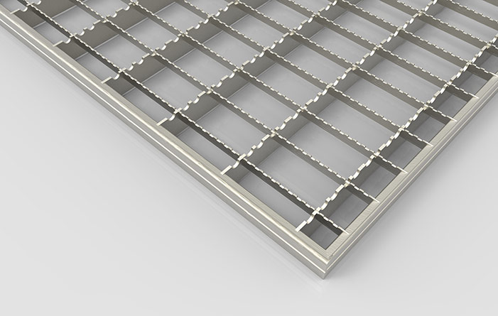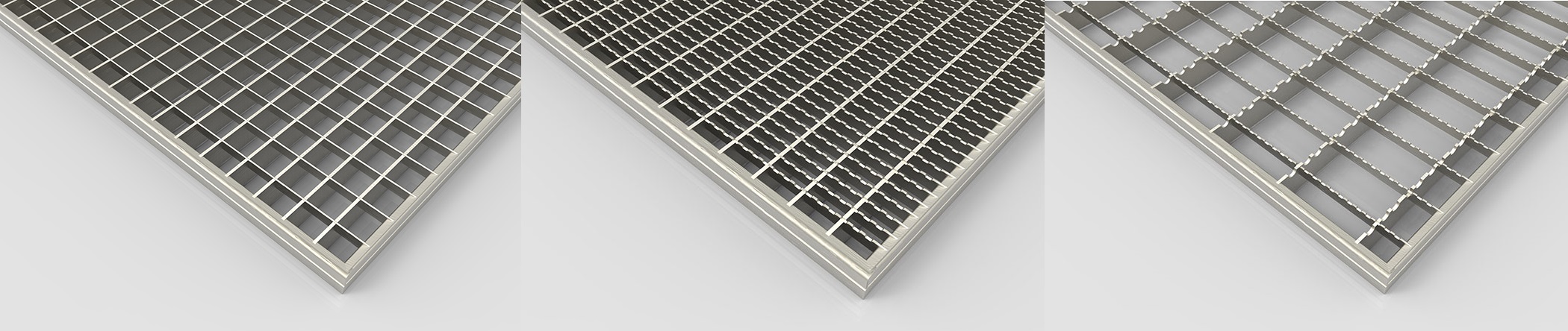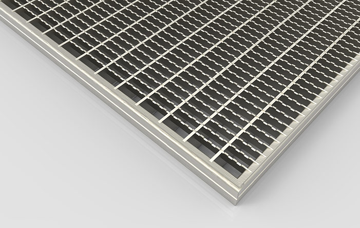 Pressed gratings are sturdy grids of bearing bars and crossbars made from steel strip. The sizes are extremely precise thanks to our sophisticated, computerised production process that also ensures the accurate coiling, straightening, punching and cutting of strip steel. The crossbars are automatically pressed into the bearing bars and enclosed by an edge, guaranteeing a rigid panel. As standard the V-edge is used, but it is also possible to choose a flat edge or T-profile edge.