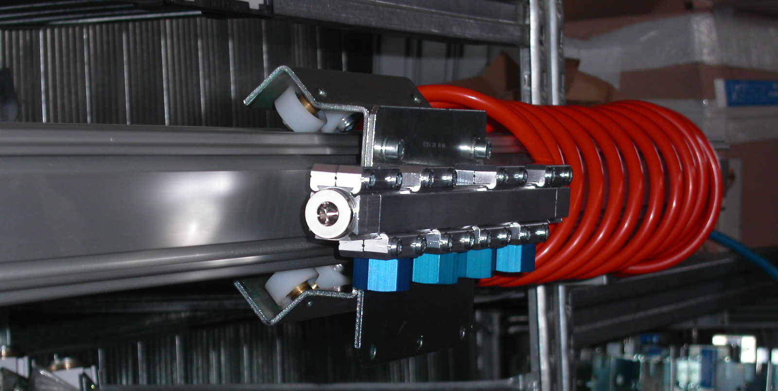 (MAT) Modular Air Trolley – the trolley, on hollow bar is equipped with 6 ball bearing wheels running on HBS 50mm profile and uses ½” hose.