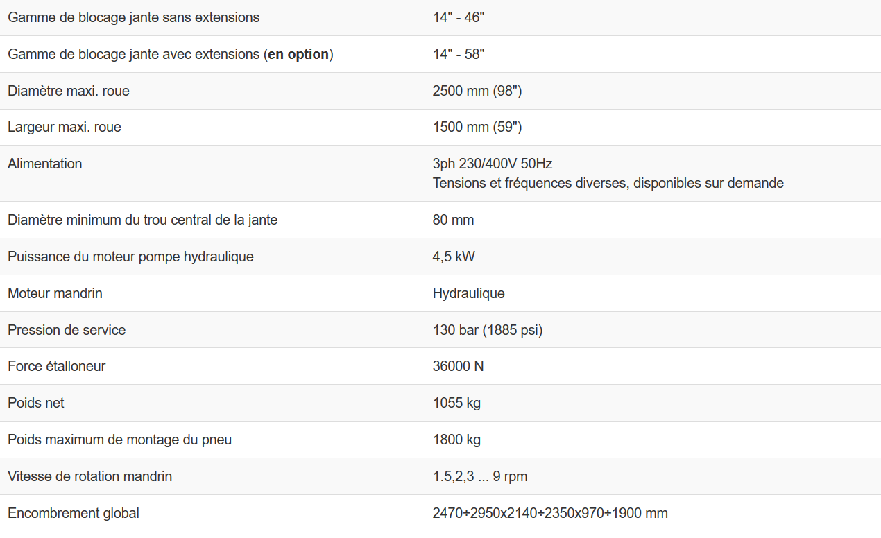 - Hauteur minimale du mandrin de blocage 315 mm du sol (centre de la roue);