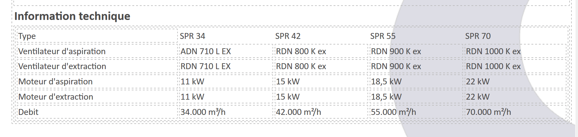 Les ventilateurs centrifuges ont des pales obliquées en avant, aspiration double, actionné par V-courroie. Ça veut dire qu’on peut régler la rotation du ventilateur.