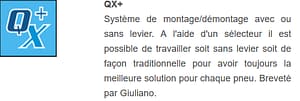 - Equipé standard de dispositif “QX PLUS” avec système “Lever-No Lever” (brevet Giuliano) pour le montage et le démontage de roues voiture sans l’emploi du levier décolle-talon, avec l’option de pouvoir utiliser le levier si nécessaire;