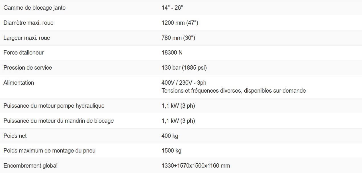 Démonte-pneus pour roues P.L. avec jante de 14″ à 26″ (diamètre maxi. roue 1200 mm./47″, largeur maxi. roue 780 mm./30″), équipé de système manuel de centrage de roue par bride et cônes; équipé de double outil traditionnel pour le montage/démontage de roues tubeless et/ou avec chambre à air.