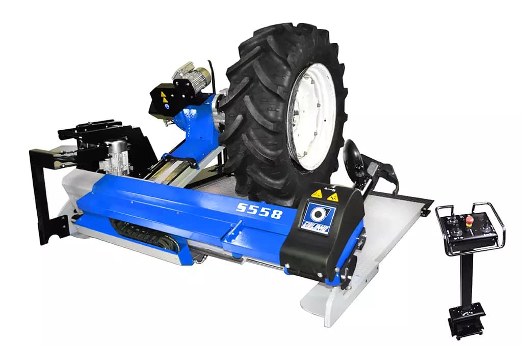 Démonte-pneus super-automatique pour roues camion et P.L. avec jante de 12″ à 46″/58(1) (diamètre roue maxi. 2500 mm./98″, largeur roue maxi. 1500 mm./58″), équipé de mandrin centreur à deux vitesses de rotation, de bras porte-outil et de bras porte-mandrin à déplacement automatique ainsi que d’outil à rotation automatique, pour la plus complète automation des fonctions, et commande à distance mobile, pour la sécurité et la praticité des opérations. Le bras porte-outil et le bras porte-mandrin, se déplaçant sur le même axe et ne travaillant pas de manière contraposée, maintiennent toujours le même angle entre eux, garantissant ainsi une fonction optimale sur tout pneu. Cette solution permet en plus de travailler à n’importe quelle hauteur du sol (même peu de centimètres), garantissant ainsi de retirer le pneu en grande sécurité.