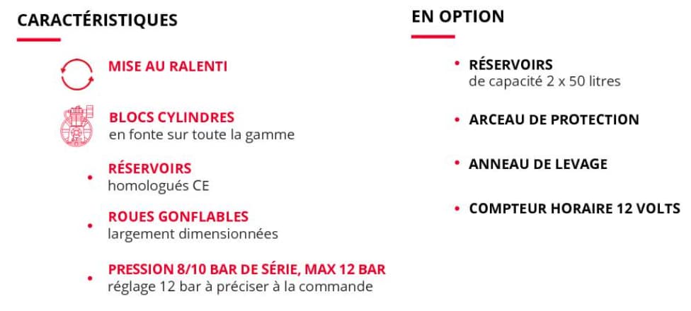 Propulsés par un moteur Lombardini, ils offrent l’avantage de disposer de réservoirs de 2×17 ou 2×50 litres pour un débit allant à 60m3/h.