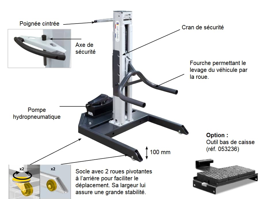 Outil de levage hydropneumatique, idéal pour les travaux sur véhicule à hauteur d’homme.