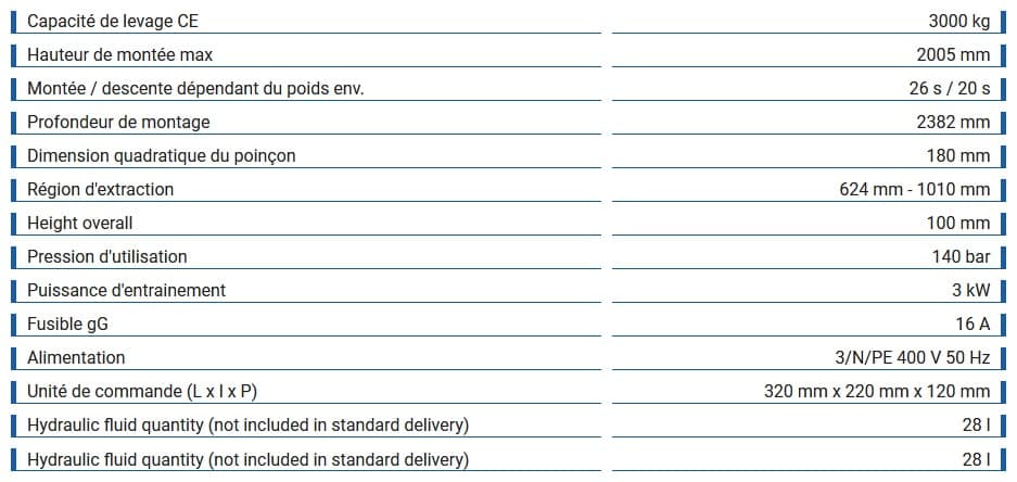 Grande vitesse de levage et d’abaissement garantie (respectivement 26 s max. )