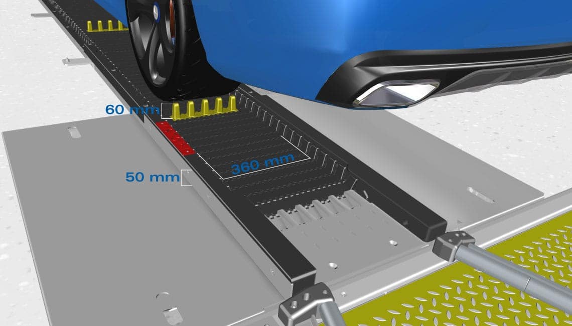 Le conducteur avance au moyen de la plaque de guidage et arrête le véhicule sur le convoyeur d’accès (le mécanisme de traction pour roue se trouve en haut, en position centrale en tant que seuil de freinage). L’accès s’effectue selon le programme sélectionné sur le pupitre de commande à distance. Le convoyeur d’accès défile et le mécanisme de traction pour roue pousse la roue avant droite jusqu’à ce que la roue avant gauche se trouve sur le convoyeur principal (chaîne de brin double ou convoyeur avec plaques). Là, le véhicule est récupéré depuis le convoyeur principal et tiré.