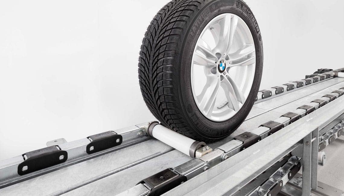 Le recours à des plaques en plastique permet d’éliminer le risque d’endommagement des jantes dans le mécanisme de transport. Les bords intégrés au convoyeur protègent les pneus et assurent un guidage stable étant donné qu’ils accompagnent la roue.