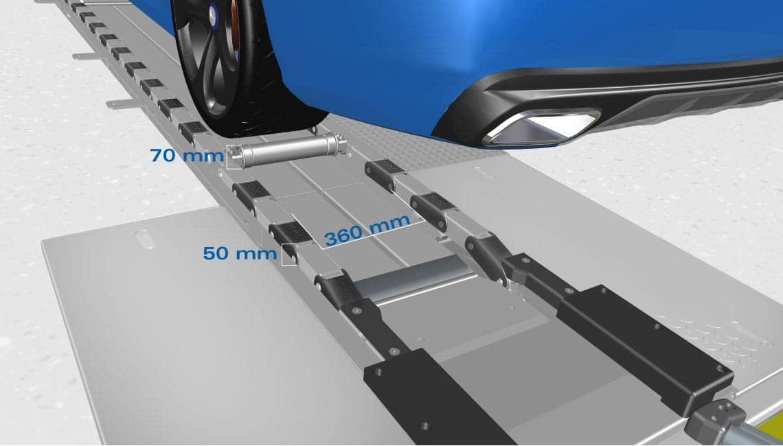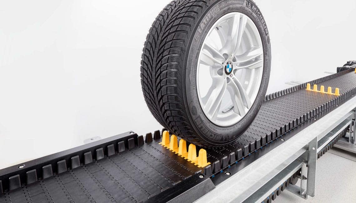 Le recours à des plaques en plastique permet d’éliminer le risque d’endommagement des jantes dans le mécanisme de transport. Les bords intégrés au convoyeur protègent les pneus et assurent un guidage stable étant donné qu’ils accompagnent la roue.