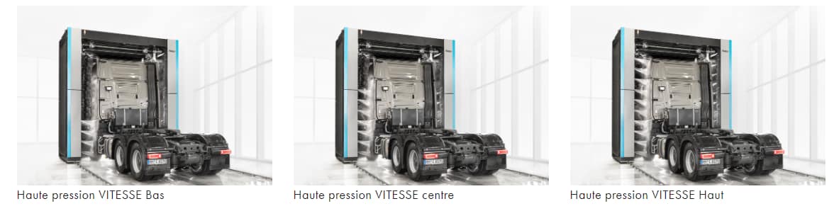 La VITESSE est disponible en différentes hauteurs afin d’obtenir un résultat de lavage optimal pour chaque hauteur de véhicule. La haute pression fonctionne de manière oscillante avec des buses rotatives ou des buses rigides et peut être utilisée avec une pression allant jusqu’à 80 bars.