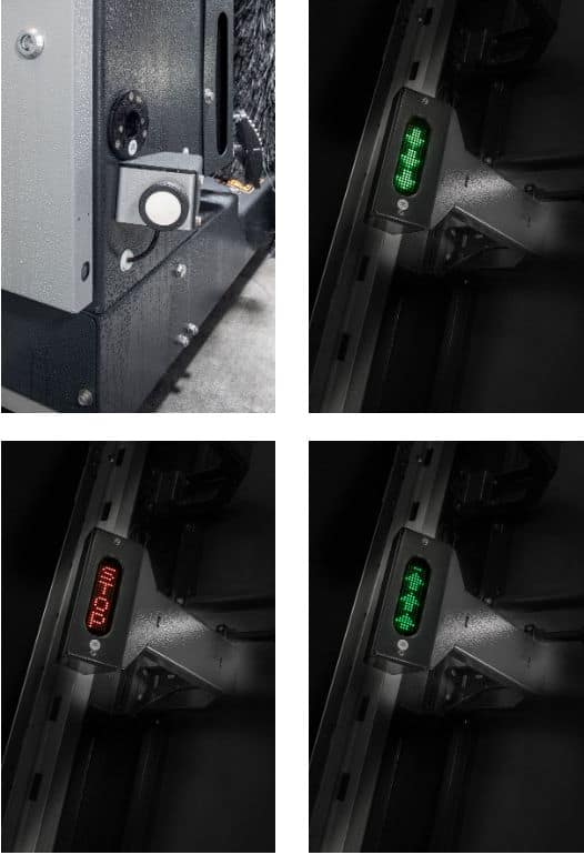 De plus, le positionnement correct est possible grâce à un capteur à ultrasons qui, à l’instar d’une aide au stationnement pour voitures, indique au conducteur le positionnement correct dans l’installation de lavage par des signaux de couleur / des intensités de couleur.