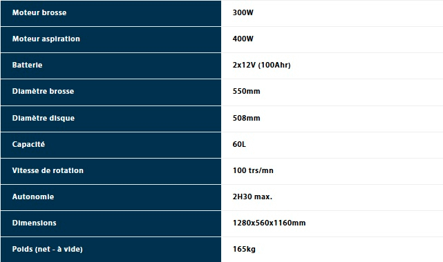 Autolaveuse à traction semi-automatique, équipée de batteries gel 24V sans entretien (avec chargeur intégré). Elle possède une grande capacité (60L).