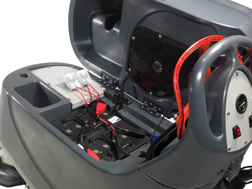 Autolaveuse à traction semi-automatique, équipée de batteries gel 24V sans entretien (avec chargeur intégré). Elle possède une grande capacité (60L).