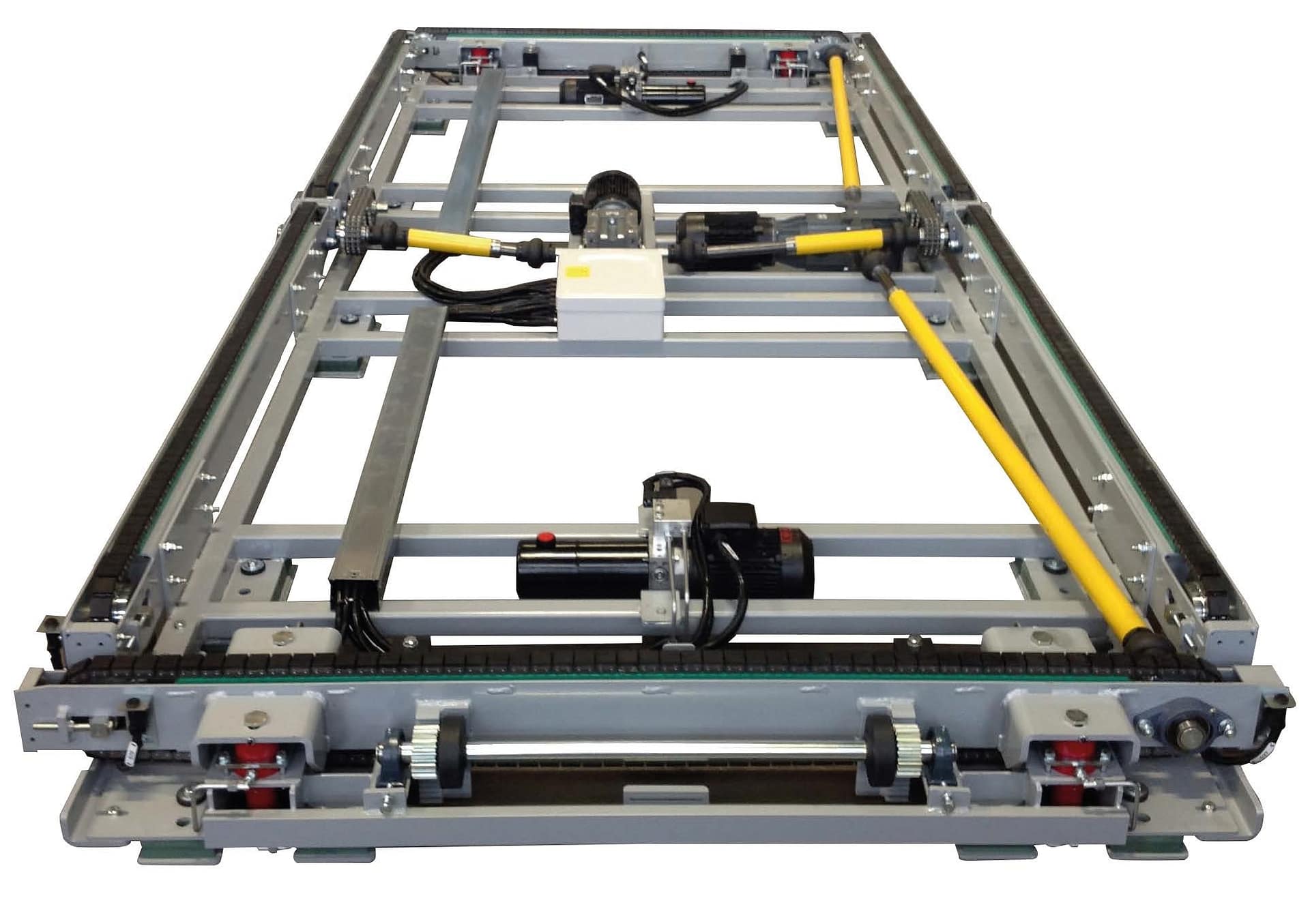 les côtés courts de la cellule de transfert se soulèvent, surplombant les côtés longs du mécanisme, et les chaînes des côtés courts, en tournant, font déplacer la plate-forme. Au contraire, lorsque les côtés courts redescendent au-dessous du niveau des mécanismes des côtés longs, la plate-forme se déplace dans la direction longitudinale.
