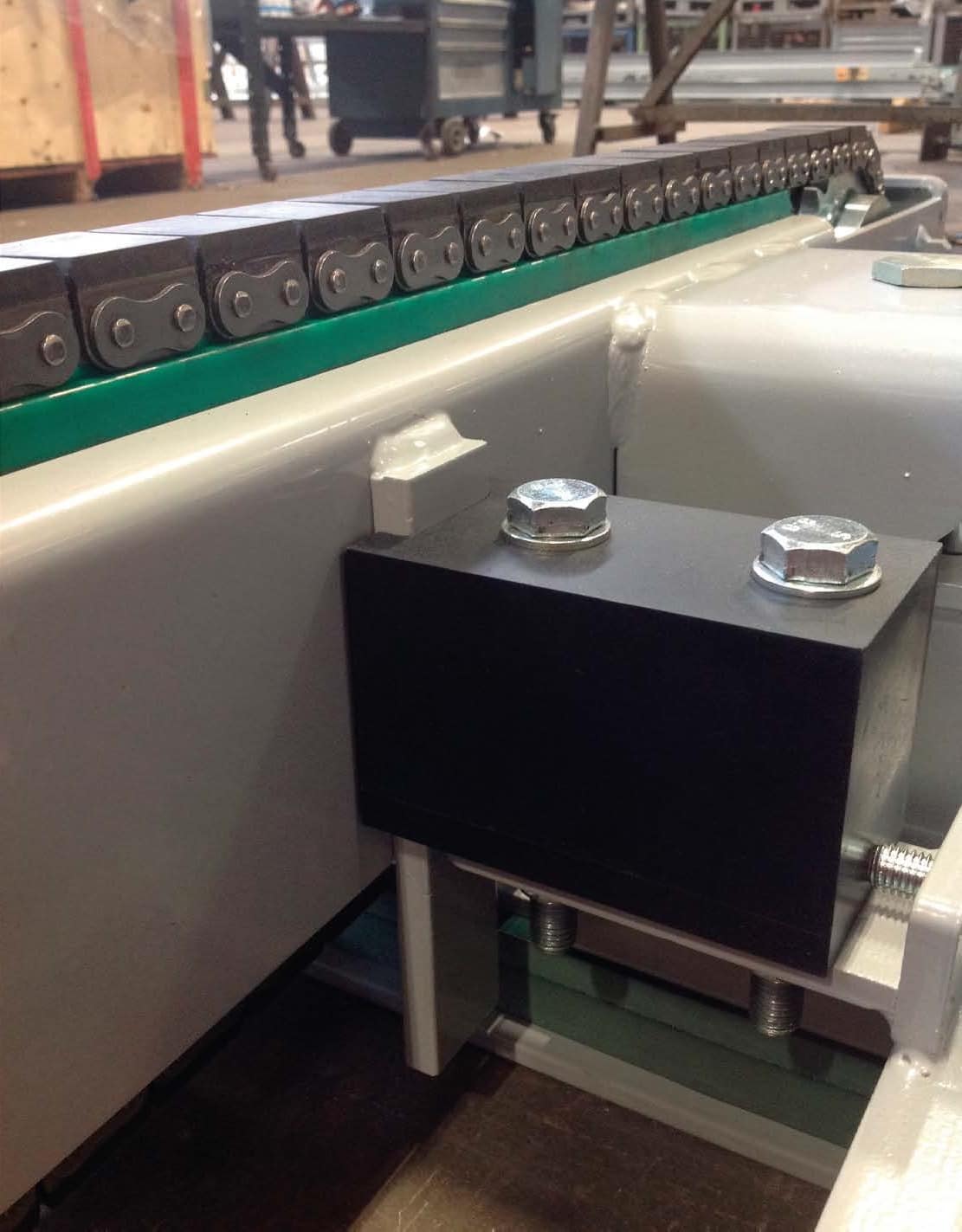 le côté long est équipé de 2 chaînes reliées par un système de pignons avec une troisième chaîne.