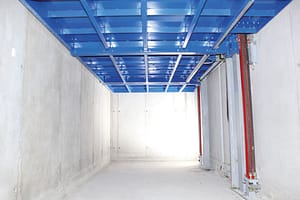 La vue sous-jacente à la plateforme montre les différents renforcements qui forment une plateforme robuste et indéformable, même lorsque les charges sont disposées sur un côté seulement, ou ne sont pas centrées.