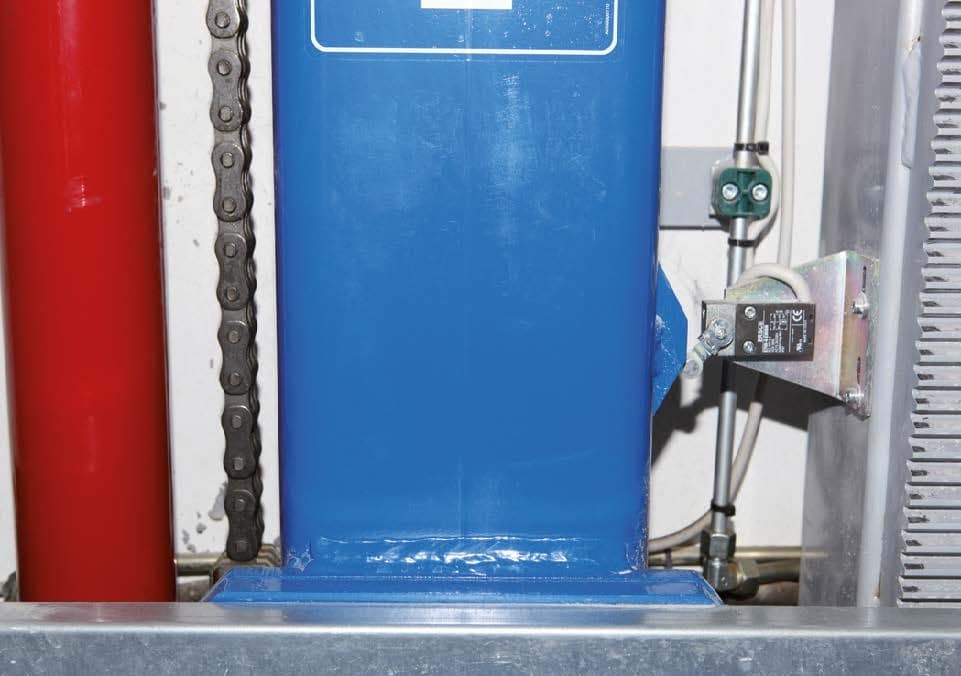Un système de fin de course est placé au niveau de la base du piston en vue de contrôler la tension des chaînes de levage (deux par piston) afin de permettre le blocage de la plateforme en cas de dysfonctionnement ou de rupture d’au moins une chaîne.