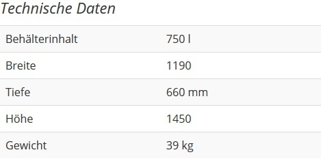 Capacité 750 litres, sans palette, poids environ 39 kg