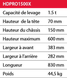 • Le cric extra-plat HDPRO1500X est sans conteste le cric le mieux adapté aux problématiques de levage des véhicules légers. Il repousse les limites de ses concurrents. • Avec sa prise très basse à 70mm (une des plus basses du marché) et sa très faible hauteur de châssis 150mm il se glisse sous les véhicules de tourisme les plus bas.