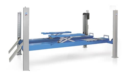 Elévateur roue libre électro-hydraulique intégré dans les chemins de roulement à longueur réglable et synchronisation hydraulique des mouvements de montée et de descente.