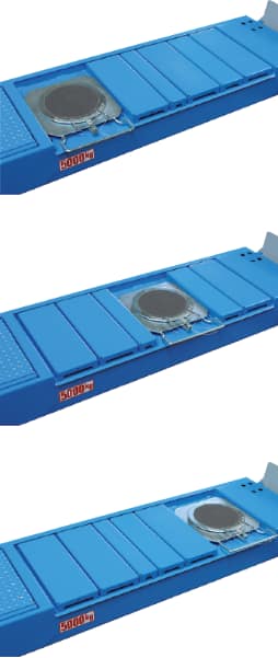 Chemins de roulement pour géométrie totale extra-longs avec logements avant pour plateaux pivotants et plans mobiles arrière.