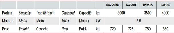 La version RAV 535 peut soulever jusqu’à 3500kg , lève 750 mm et à 100 mm de taille basse