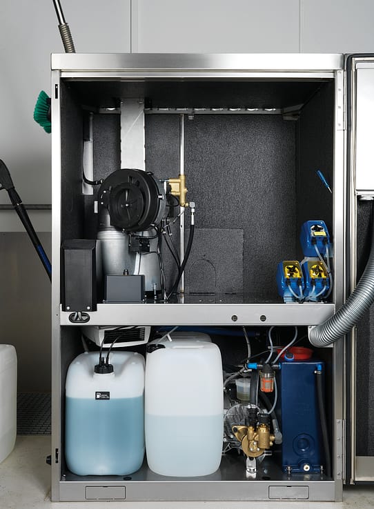 La conception tout INOX du SH AUTO permet un positionnement en extérieur grâce à son armoire hors gel (jusqu’à -20°C) : chauffage interne, protection des accessoires, bac tampon chauffé.