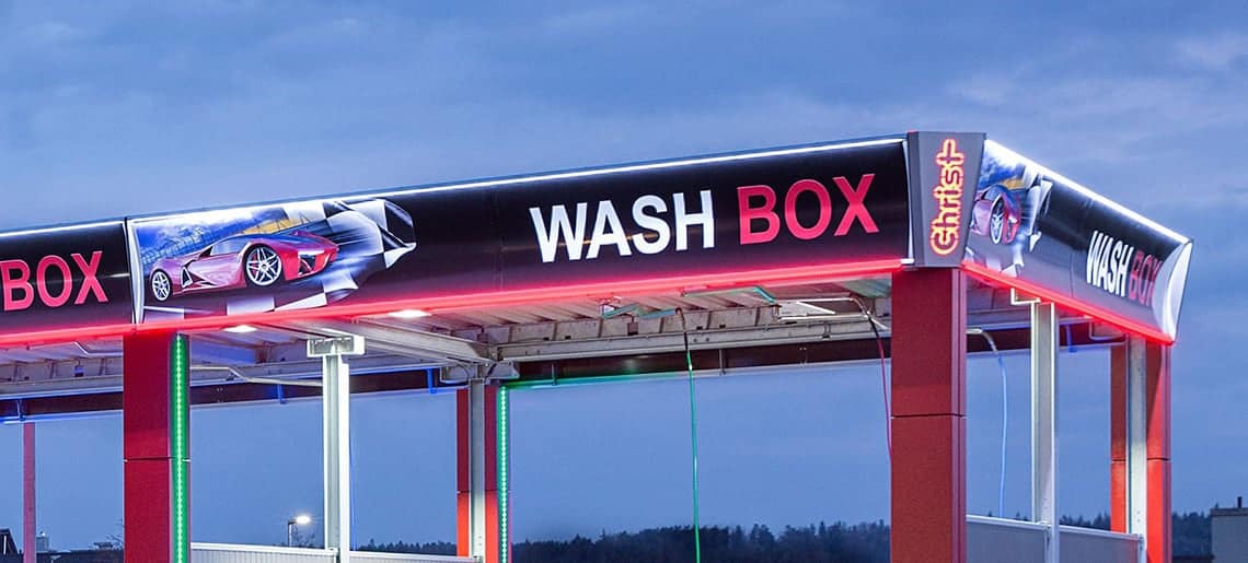 Publicité efficace grâce à une conception élégante. Attique résistant aux intempéries avec plaques en aluminium revêtus par pulvérisation, avec film spécial, avec des inscriptions selon les souhaits du client. Intégré dans le profil en aluminium supérieur : Bandes lumineuses DEL blanches pour l’éclairage de l’attique. Intégré dans le profil en aluminium inférieur : Bandes lumineuses DEL couleurs (RVB) pour l’effet à distance de l’attique. Le point fort est l’attique moderne avec éclairage DEL inclus contenu de série dans la livraison. La conception d’attique correspondante est particulièrement efficace au crépuscule. Les économies d’énergie grâce à l’innovante technique DEL s’élève à jusqu’à 70 % par rapport aux systèmes d’éclairage avec tubes fluorescents. L’éclairage DEL ne permet pas seulement d’économiser du courant : il nécessite aussi moins de maintenance (en moyenne une durée de combustion 10 fois plus longue que les tubes fluorescents) tout en offrant une lumière régulière sans scintillement et sans rayonnement UV. Associée avec la technique de place de lavage puissante de Christ, la station SKYLINE devient un système complet offrant un maximum d’avantages pour le client avec des coûts d’exploitation optimisés.